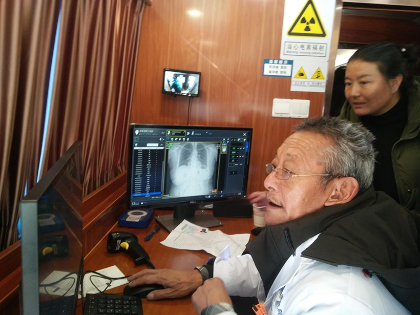 圖為我院放射科主任次仁加錯主任為患者進(jìn)行胸片拍攝準(zhǔn)備工作。