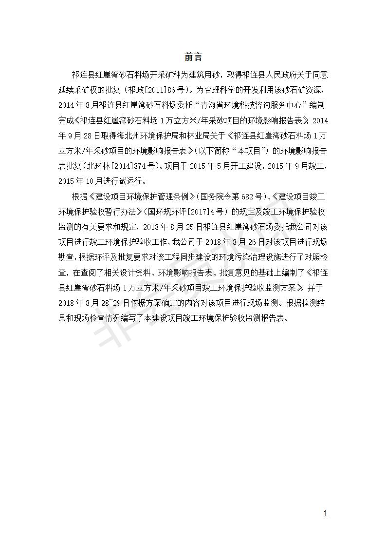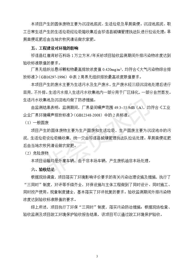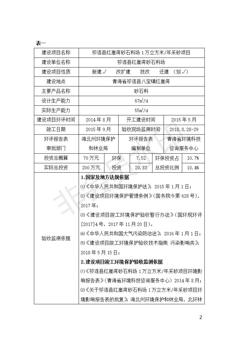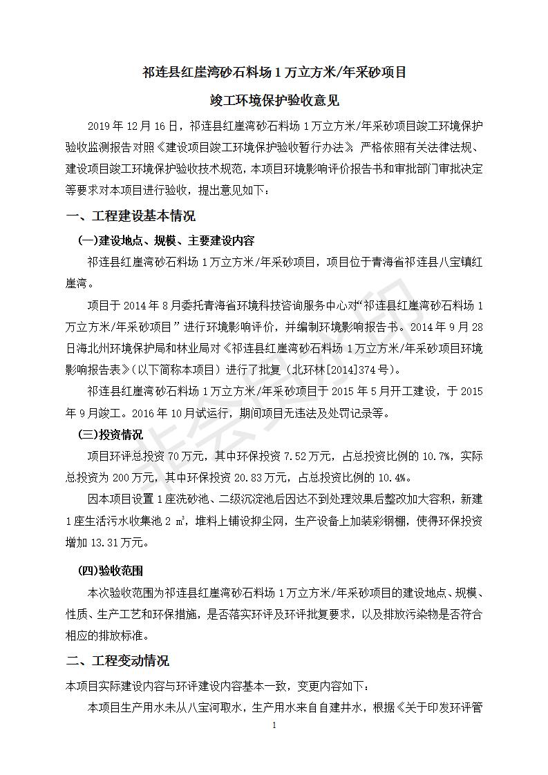 祁連縣紅崖灣砂石料場1萬立方米/年采砂項目竣工環(huán)境保護驗收監(jiān)測報告表公示