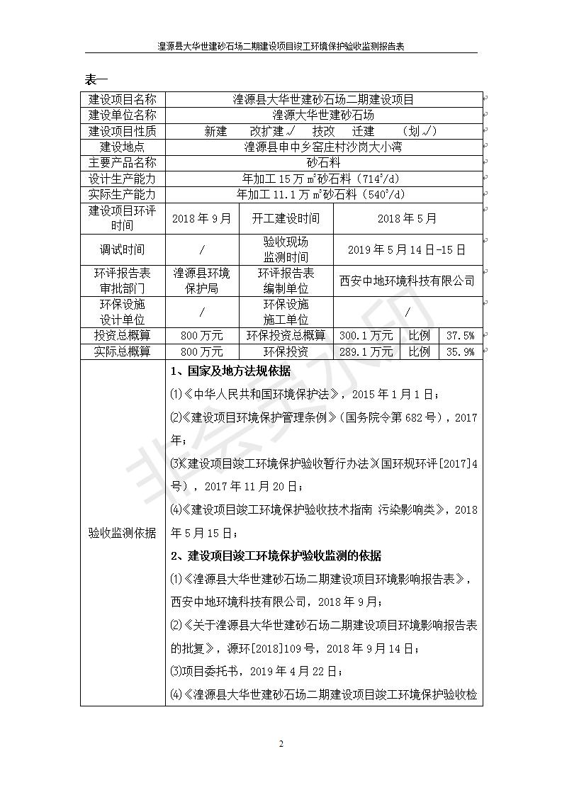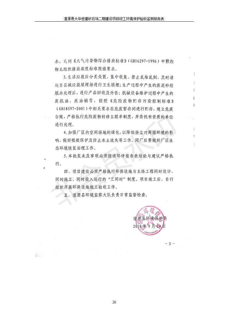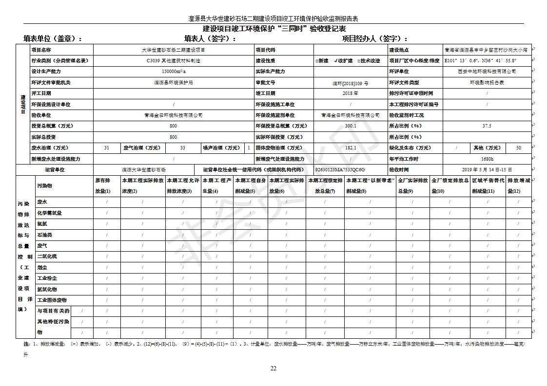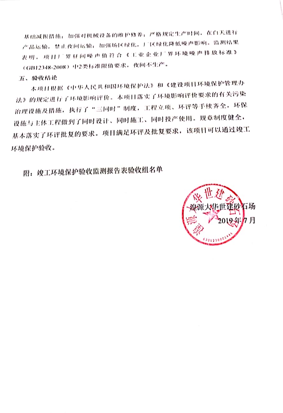 根據(jù)中華人民共和國國務(wù)院令第682號(hào)《國務(wù)院關(guān)于修改〈建設(shè)項(xiàng)目環(huán)境保護(hù)管理?xiàng)l例〉的決定》和《建設(shè)項(xiàng)目竣工環(huán)境保護(hù)驗(yàn)收暫行辦法》(國務(wù)院令682號(hào)),湟源大華世建砂石場湟源縣大華世建砂石場二期建設(shè)項(xiàng)目(包括竣工環(huán)境保護(hù)驗(yàn)收監(jiān)測(cè)報(bào)告表和驗(yàn)收意見)公示如下。 一、項(xiàng)目名稱:湟源縣大華世建砂石場二期建設(shè)項(xiàng)目 二、地點(diǎn):湟源縣申中鄉(xiāng)窯莊村沙崗大小灣 三、建設(shè)單位:湟源大華世建砂石場 四、建設(shè)內(nèi)容:項(xiàng)目主要建設(shè)砂石料產(chǎn)品加工生產(chǎn)區(qū)、原料堆場、產(chǎn)品堆場、辦公區(qū)等。五、聯(lián)系人:張工 六、聯(lián)系電 話:0971-6515411 七、公示時(shí)間:二〇一九年七月二十五日至二〇一九年八月二十一日公示期間,對(duì)上述公示內(nèi)容如有異議,請(qǐng)以書面形式反饋,個(gè)人須署真實(shí)姓名,單位須加蓋公章。