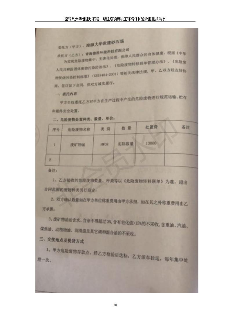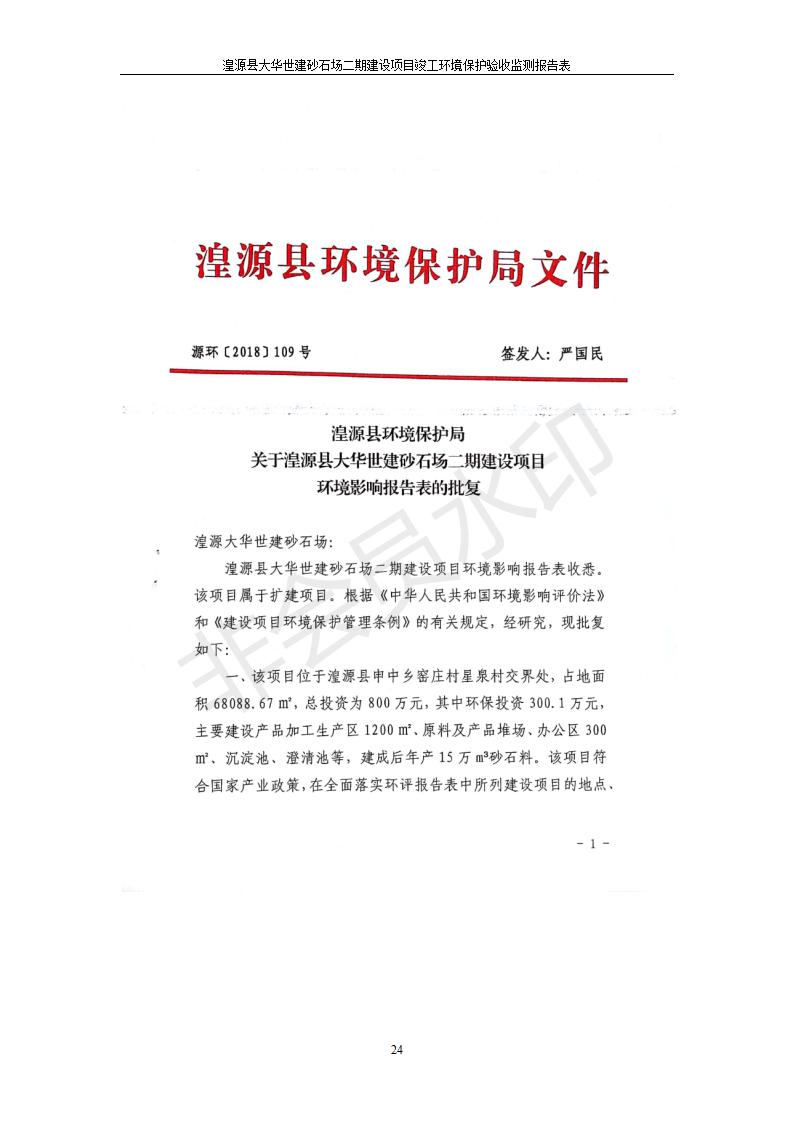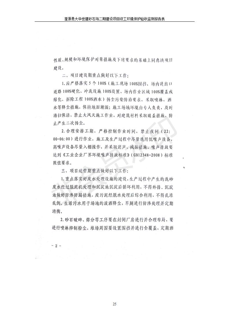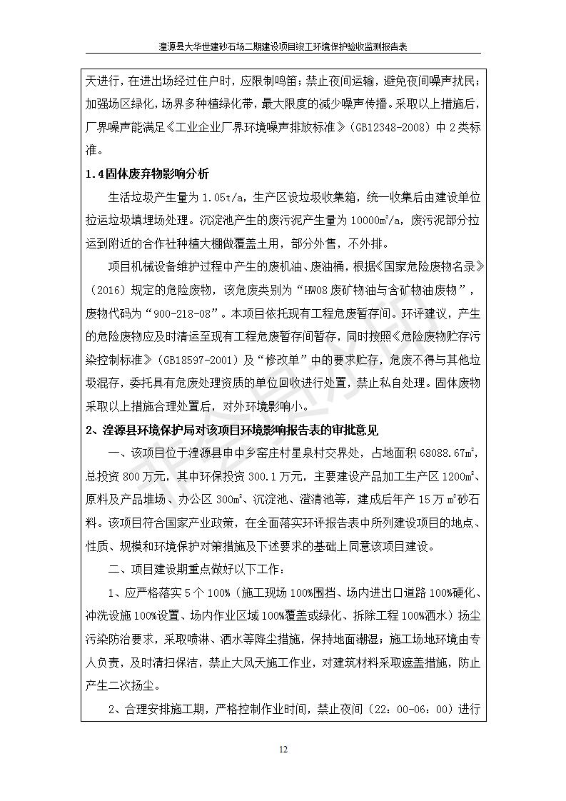 根據(jù)中華人民共和國國務(wù)院令第682號(hào)《國務(wù)院關(guān)于修改〈建設(shè)項(xiàng)目環(huán)境保護(hù)管理?xiàng)l例〉的決定》和《建設(shè)項(xiàng)目竣工環(huán)境保護(hù)驗(yàn)收暫行辦法》(國務(wù)院令682號(hào)),湟源大華世建砂石場湟源縣大華世建砂石場二期建設(shè)項(xiàng)目(包括竣工環(huán)境保護(hù)驗(yàn)收監(jiān)測(cè)報(bào)告表和驗(yàn)收意見)公示如下。 一、項(xiàng)目名稱:湟源縣大華世建砂石場二期建設(shè)項(xiàng)目 二、地點(diǎn):湟源縣申中鄉(xiāng)窯莊村沙崗大小灣 三、建設(shè)單位:湟源大華世建砂石場 四、建設(shè)內(nèi)容:項(xiàng)目主要建設(shè)砂石料產(chǎn)品加工生產(chǎn)區(qū)、原料堆場、產(chǎn)品堆場、辦公區(qū)等。五、聯(lián)系人:張工 六、聯(lián)系電 話:0971-6515411 七、公示時(shí)間:二〇一九年七月二十五日至二〇一九年八月二十一日公示期間,對(duì)上述公示內(nèi)容如有異議,請(qǐng)以書面形式反饋,個(gè)人須署真實(shí)姓名,單位須加蓋公章。
