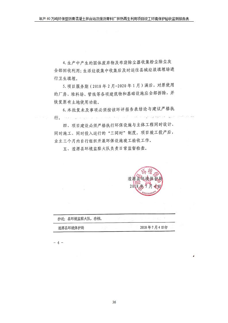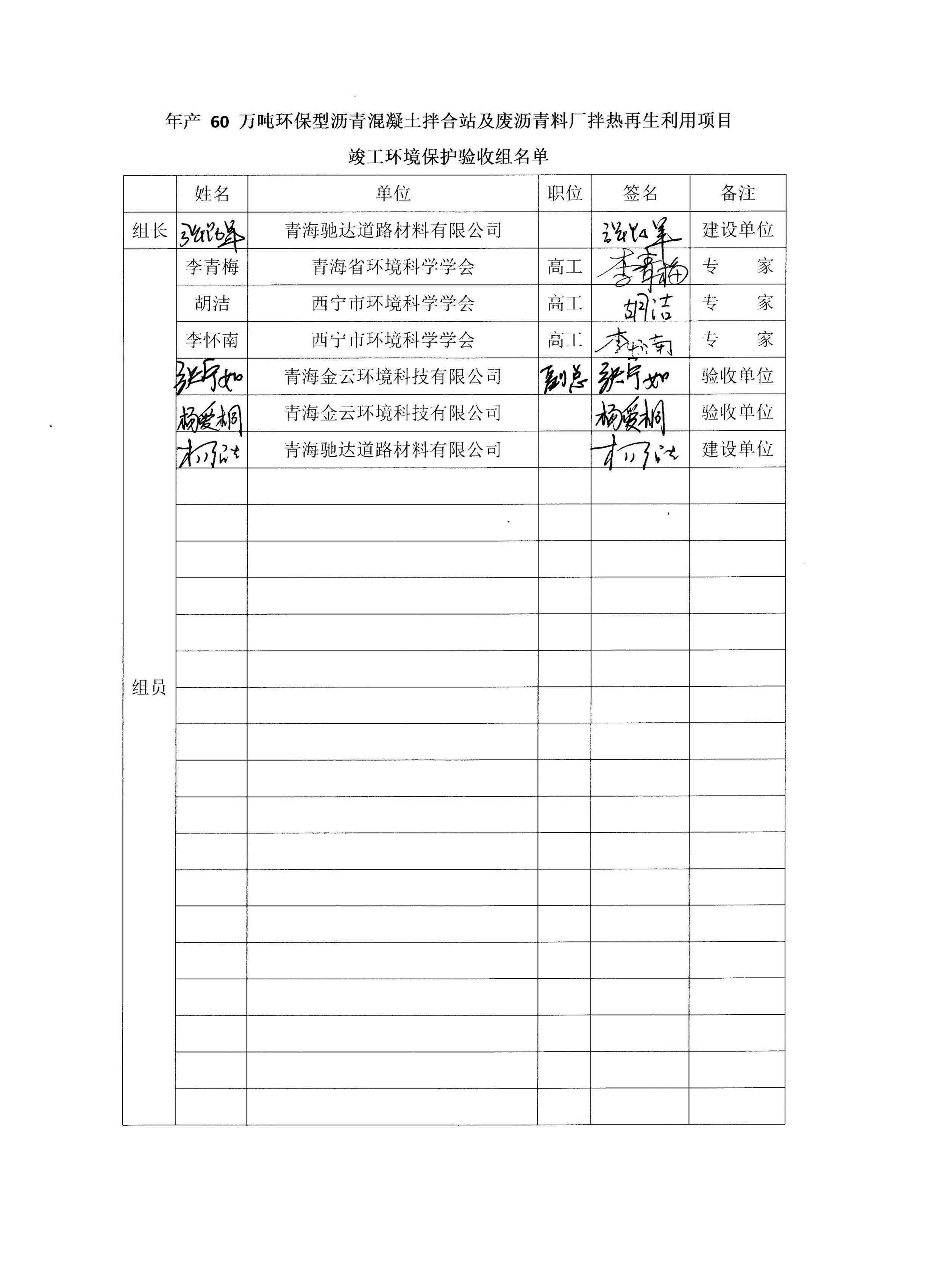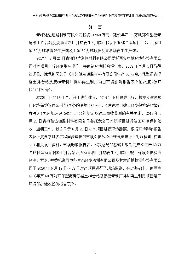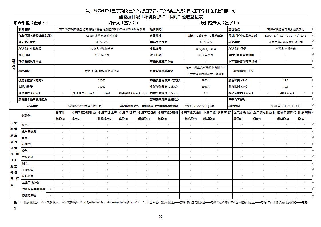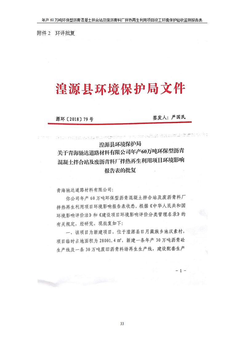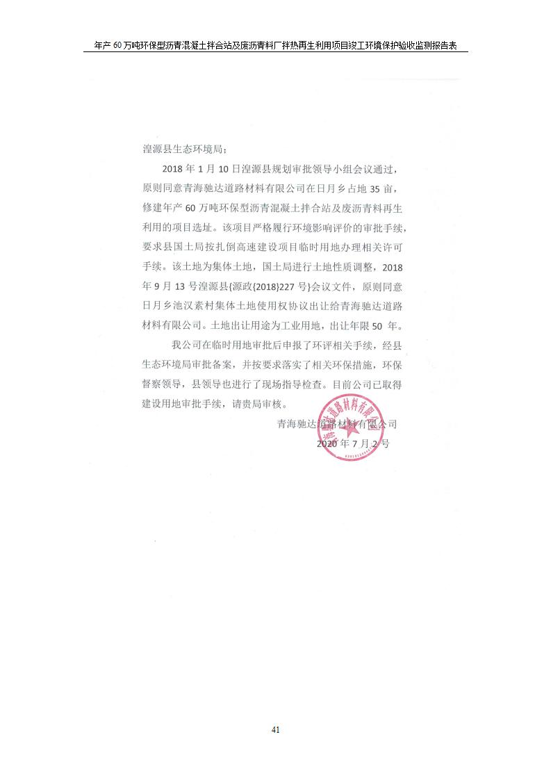 根據(jù)中華人民共和國(guó)國(guó)務(wù)院令第682號(hào)《國(guó)務(wù)院關(guān)于修改〈建設(shè)項(xiàng)目環(huán)境保護(hù)管理?xiàng)l例〉的決定》和《建設(shè)項(xiàng)目竣工環(huán)境保護(hù)驗(yàn)收暫行辦法》(國(guó)務(wù)院令682號(hào)),青海馳達(dá)道路材料有限公司年產(chǎn)60萬(wàn)噸環(huán)保型瀝青混凝土拌合站及廢瀝青料廠拌熱再生利用項(xiàng)目竣工環(huán)境保護(hù)驗(yàn)收監(jiān)測(cè)報(bào)告表公示如下。 一、項(xiàng)目名稱:年產(chǎn)60萬(wàn)噸環(huán)保型瀝青混凝土拌合站及廢瀝青料廠拌熱再生利用項(xiàng)目竣工環(huán)境保護(hù)驗(yàn)收監(jiān)測(cè)報(bào)告表 二、地點(diǎn):湟源縣日月藏族鄉(xiāng)池漢素村 三、建設(shè)單位:青海馳達(dá)道路材料有限公司 四、建設(shè)內(nèi)容:本項(xiàng)目共有2條瀝青砼生產(chǎn)線及1條穩(wěn)定土生產(chǎn)線,配套辦公樓等。 五、聯(lián)系人:楊工 六、聯(lián)系電 話:0971-6515411 七、公示時(shí)間:二〇二〇年七月六日至二〇二〇年七月三十一日 公示期間,對(duì)上述公示內(nèi)容如有異議,請(qǐng)以書(shū)面形式反饋,個(gè)人須署真實(shí)姓名,單位須加蓋公章。