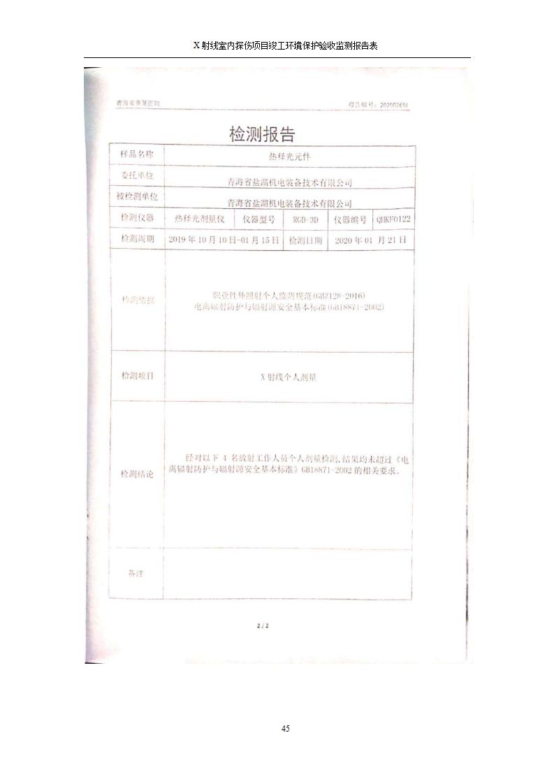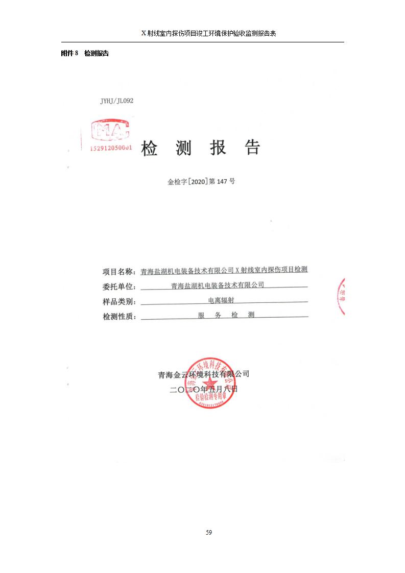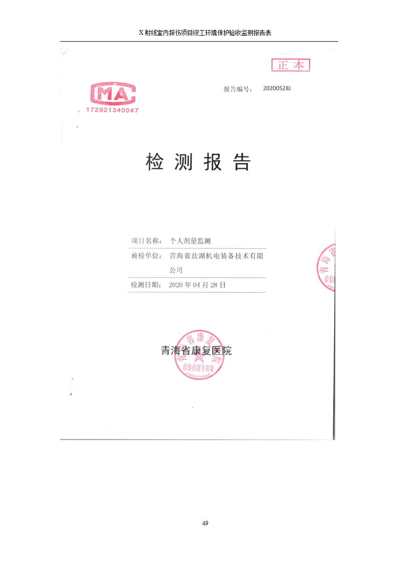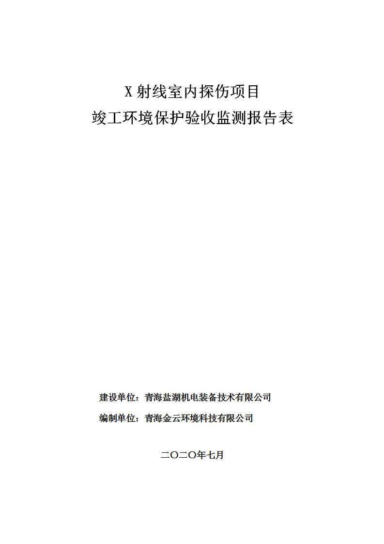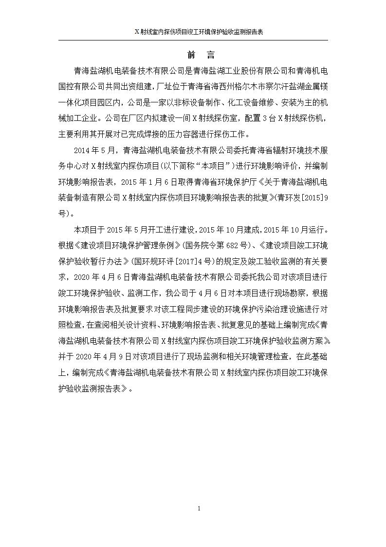 青海鹽湖機電裝備技術(shù)有限公司X射線室內(nèi)探傷項目竣工環(huán)境保護驗收監(jiān)測報告表公示發(fā)布日期:(2020-7-10) 點擊次數(shù):3417 |