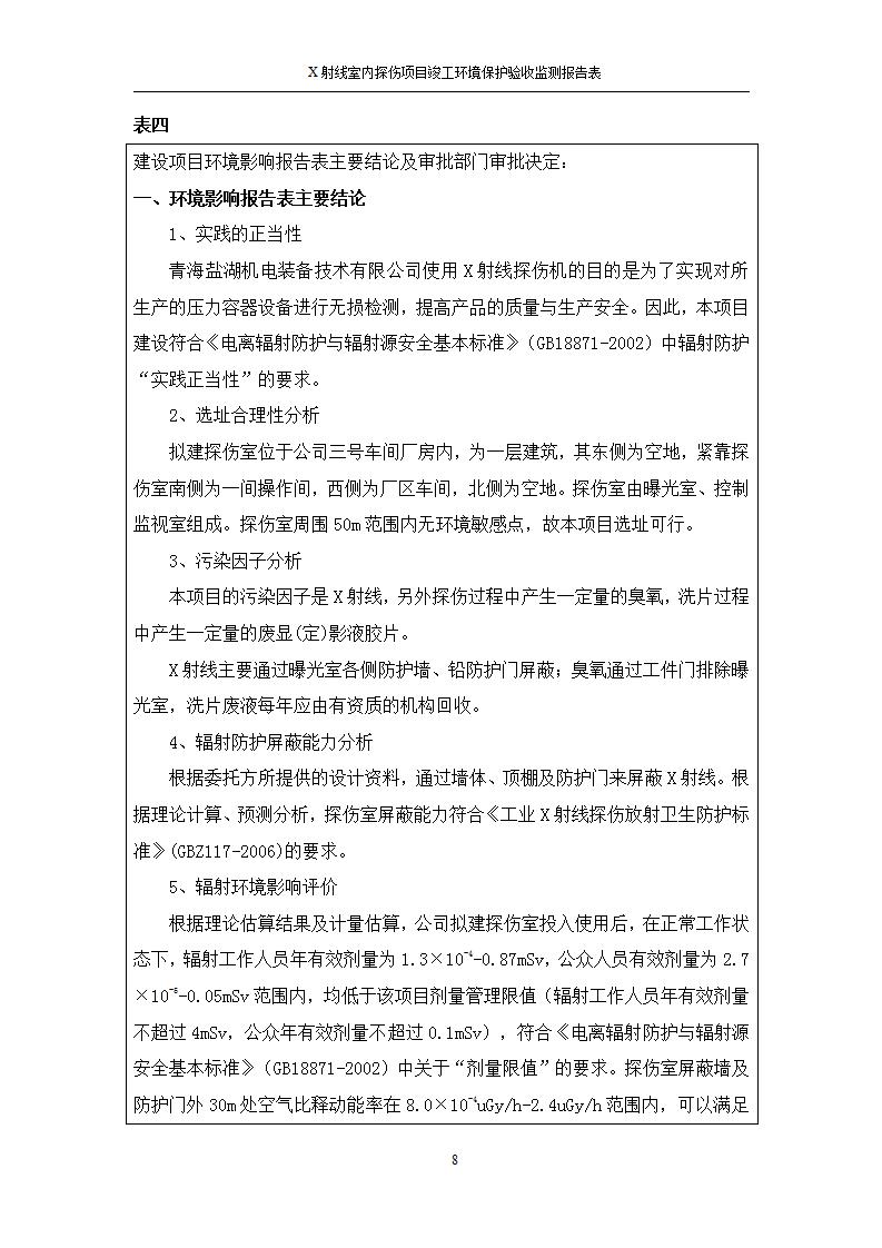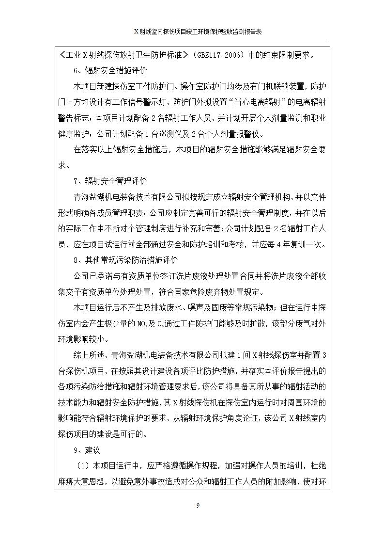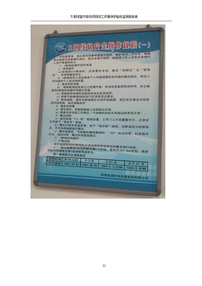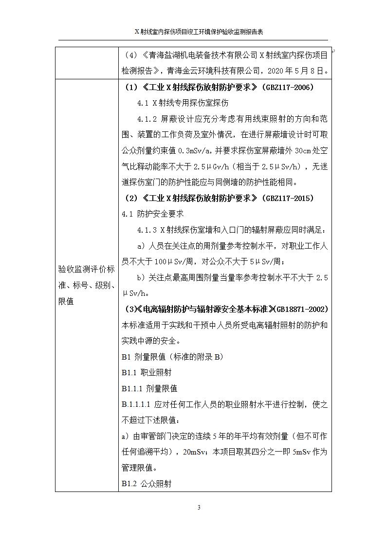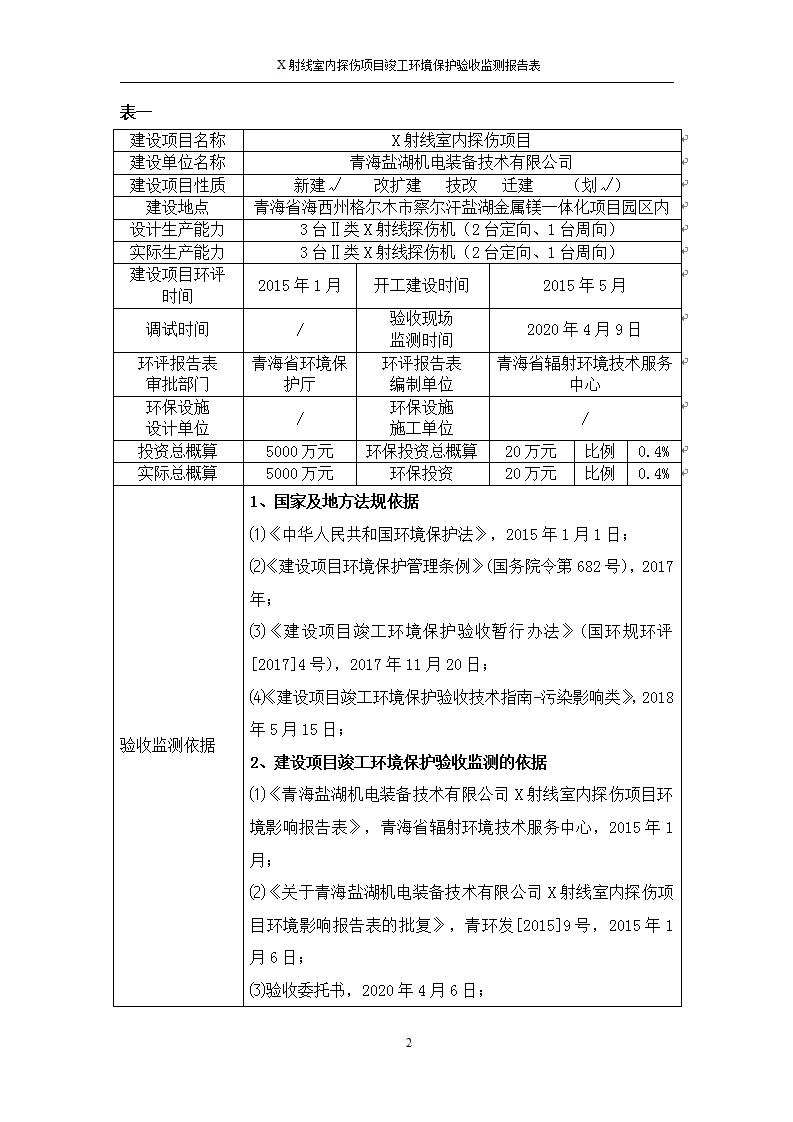 根據(jù)中華人民共和國國務院令第682號《國務院關(guān)于修改〈建設項目環(huán)境保護管理條例〉的決定》和《建設項目竣工環(huán)境保護驗收暫行辦法》(國務院令682號),青海鹽湖機電裝備技術(shù)有限公司X射線室內(nèi)探傷項目竣工環(huán)境保護驗收監(jiān)測報告表公示如下。 一、項目名稱:X射線室內(nèi)探傷項目竣工環(huán)境保護驗收監(jiān)測報告表 二、地點:青海省海西州格爾木市察爾汗鹽湖金屬鎂一體化項目園區(qū)內(nèi) 三、建設單位:青海鹽湖機電裝備技術(shù)有限公司 四、建設內(nèi)容:本項目位于公司三號車間廠房內(nèi),探傷室長21m,寬9.3m,共有3臺X射線探傷機。 五、聯(lián)系人:楊工 六、聯(lián)系電 話:0971-6515411 七、公示時間:二〇二〇年七月十日至二〇二〇年八月六日 公示期間,對上述公示內(nèi)容如有異議,請以書面形式反饋,個人須署真實姓名,單位須加蓋公章。