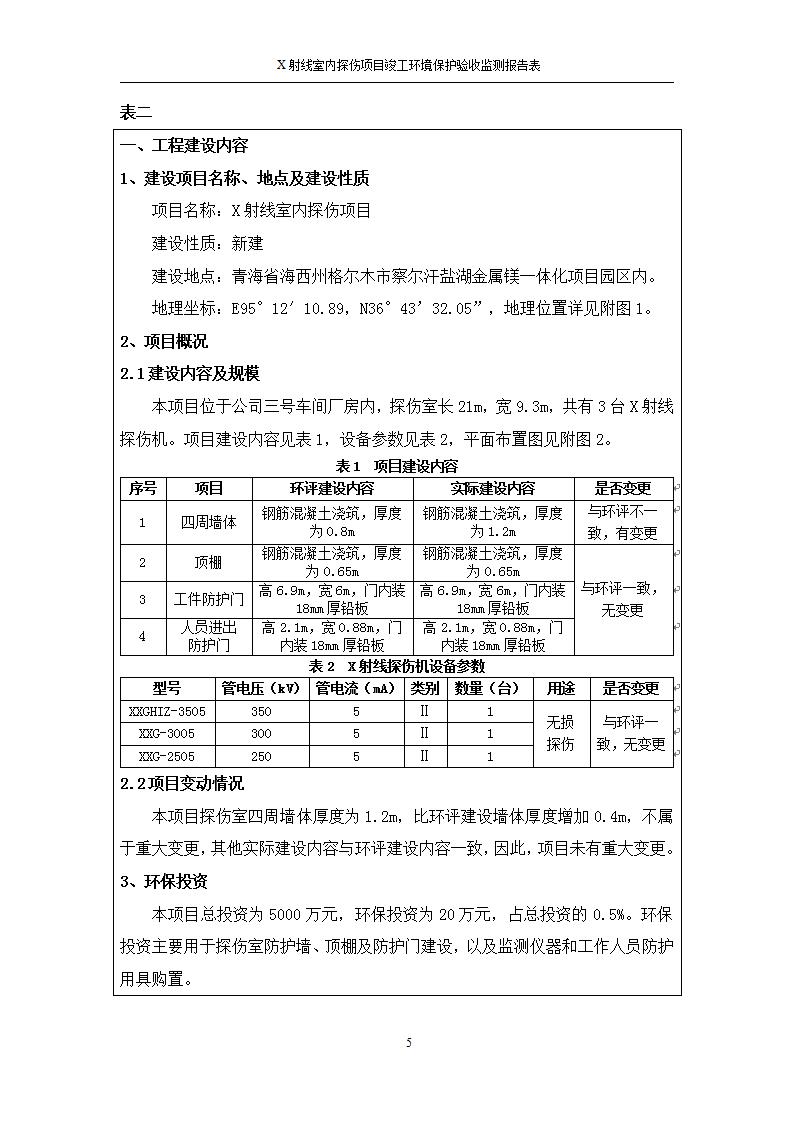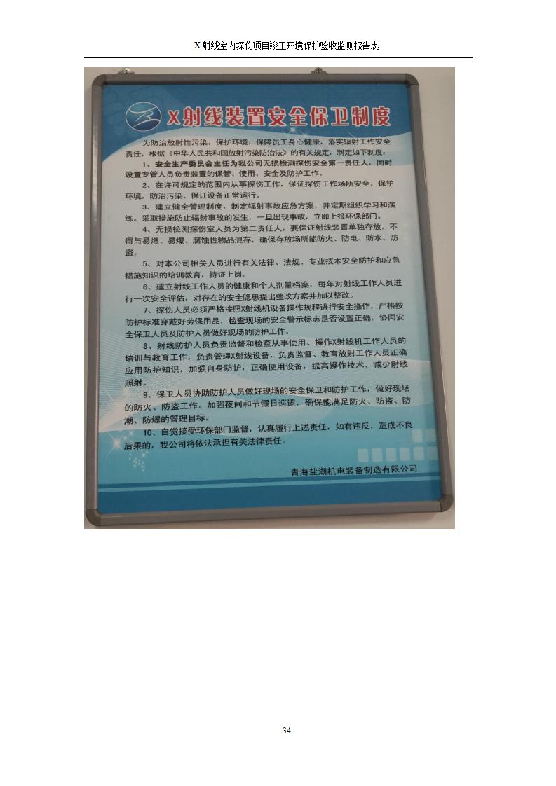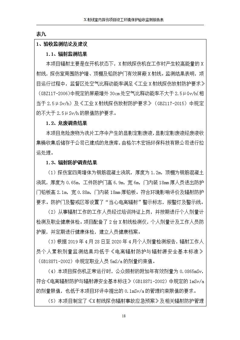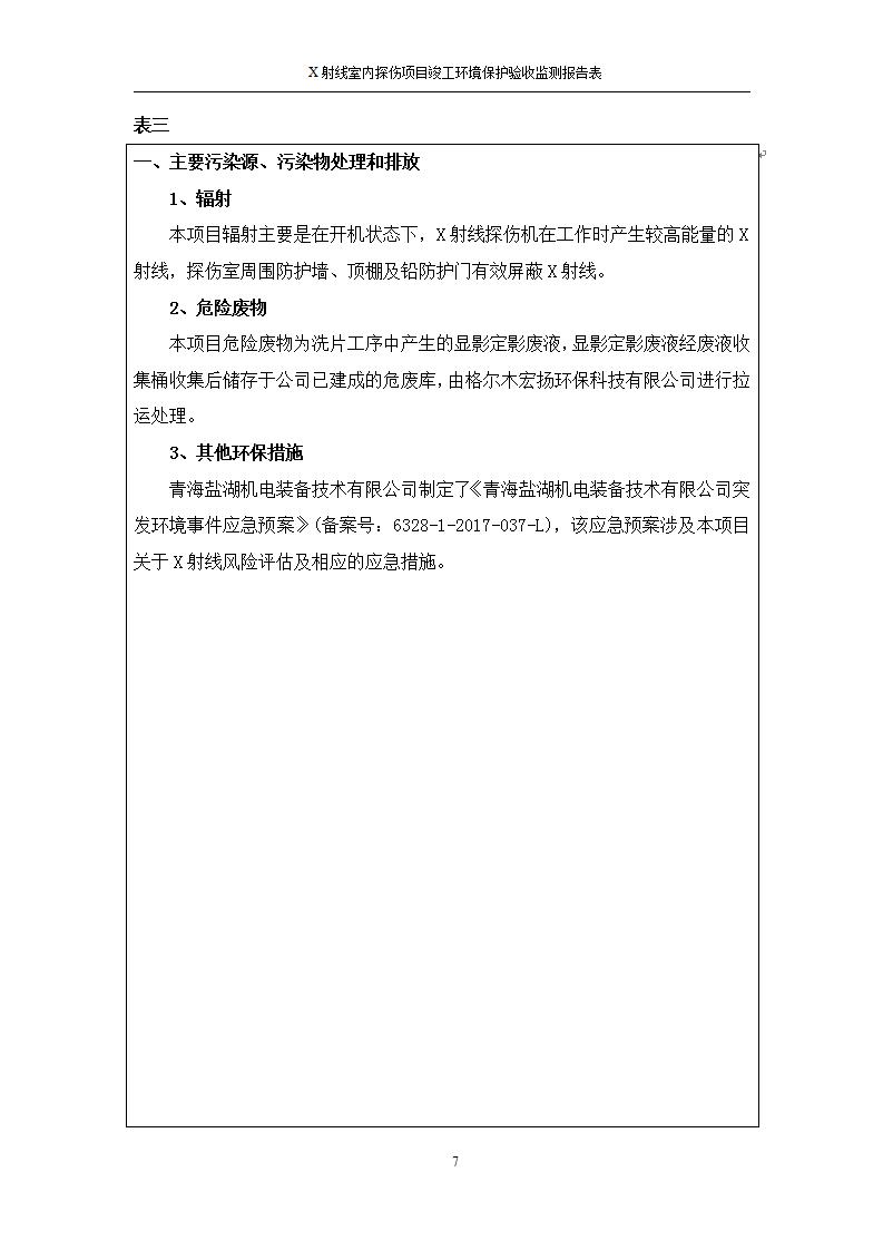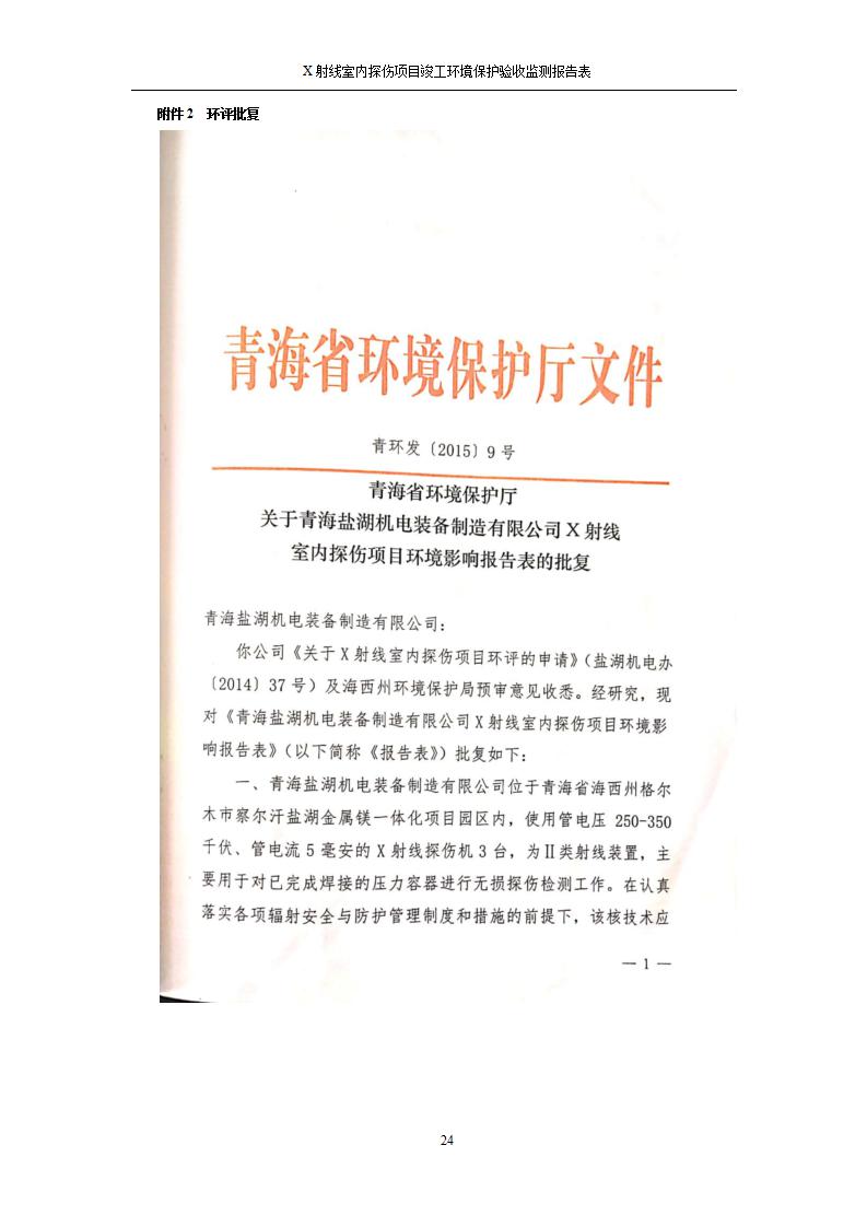 根據(jù)中華人民共和國國務院令第682號《國務院關(guān)于修改〈建設項目環(huán)境保護管理條例〉的決定》和《建設項目竣工環(huán)境保護驗收暫行辦法》(國務院令682號),青海鹽湖機電裝備技術(shù)有限公司X射線室內(nèi)探傷項目竣工環(huán)境保護驗收監(jiān)測報告表公示如下。 一、項目名稱:X射線室內(nèi)探傷項目竣工環(huán)境保護驗收監(jiān)測報告表 二、地點:青海省海西州格爾木市察爾汗鹽湖金屬鎂一體化項目園區(qū)內(nèi) 三、建設單位:青海鹽湖機電裝備技術(shù)有限公司 四、建設內(nèi)容:本項目位于公司三號車間廠房內(nèi),探傷室長21m,寬9.3m,共有3臺X射線探傷機。 五、聯(lián)系人:楊工 六、聯(lián)系電 話:0971-6515411 七、公示時間:二〇二〇年七月十日至二〇二〇年八月六日 公示期間,對上述公示內(nèi)容如有異議,請以書面形式反饋,個人須署真實姓名,單位須加蓋公章。